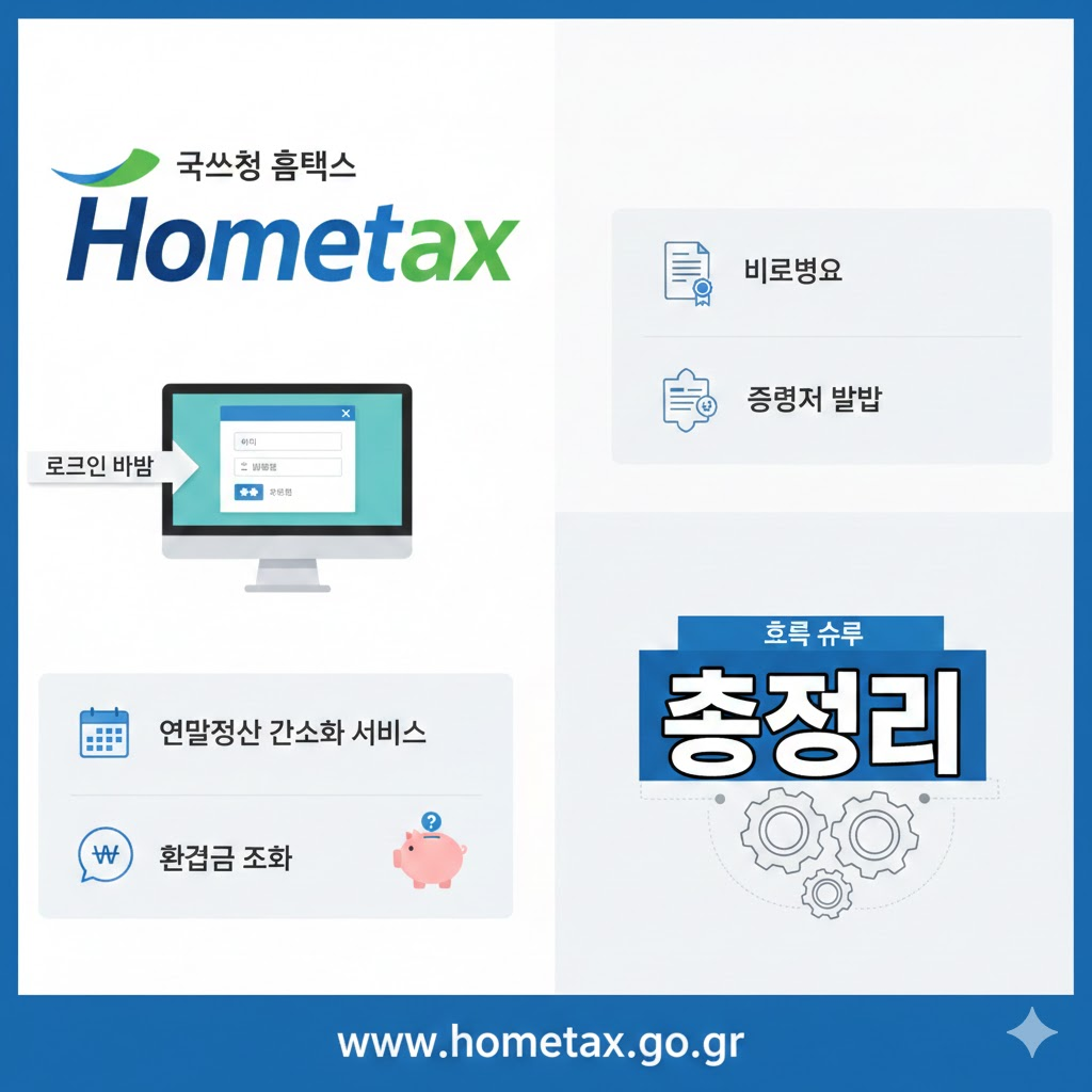 국세청 홈택스 홈페이지를 찾고 계신가요? 세금 신고부터 환급금 조회, 각종 증명서 발급까지 모든 세무 업무를 온라인에서 처리할 수 있는 홈택스는 직장인과 사업자 모두에게 필수 서비스입니다. 이 글에서는 2025년 기준 홈택스 바로가기 접속 방법, 로그인 방법, 연말정산 간소화 서비스, 환급금 조회, 증명서 발급 방법까지 상세히 정리했습니다.