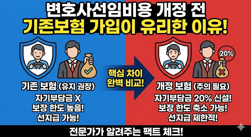 변호사선임비용 개정 전 기존보험 가입이 유리한 이유를 정리한 워드프레스 HTML입니다. 변호사선임비용 보장이 현행 3천~5천만원에서 500만원으로 축소될 예정이기 때문에, 지금 기존 구조의 운전자보험을 유지하거나 가입해두는 것이 소비자에게 가장 유리한 선택입니다.